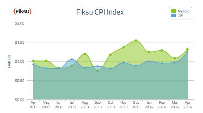 Fiksu:2014年4月份移动应用营销成本CPI指数